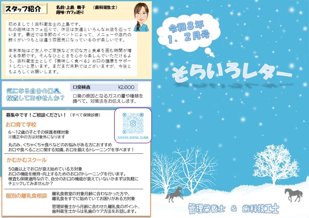 衛生士からのお口に関する知識と管理栄養士からの栄養の知識をつめこんだおたよりを2ヶ月ごとにお配りしています。